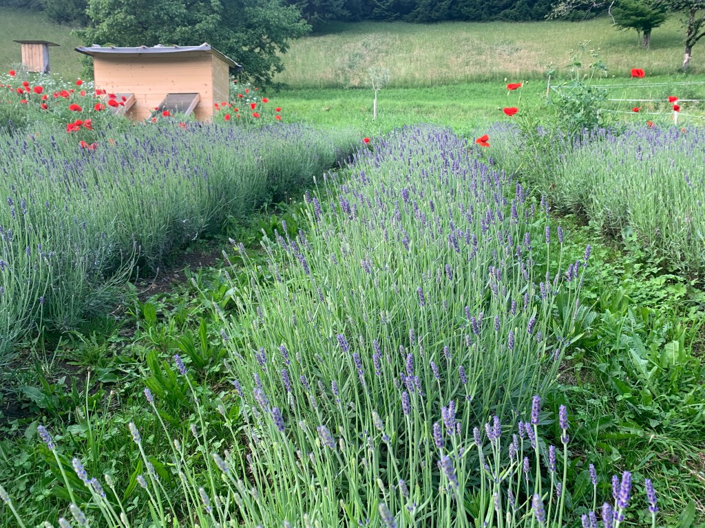 Ein Teil unseres Lavendels blüht bereits – dazwischen in tiefem rot Mohnblumen. Hoffen wir auf sonniges und heißes Wetter, damit sich der bezaubernde Duft des Lavendels entfalten kann.