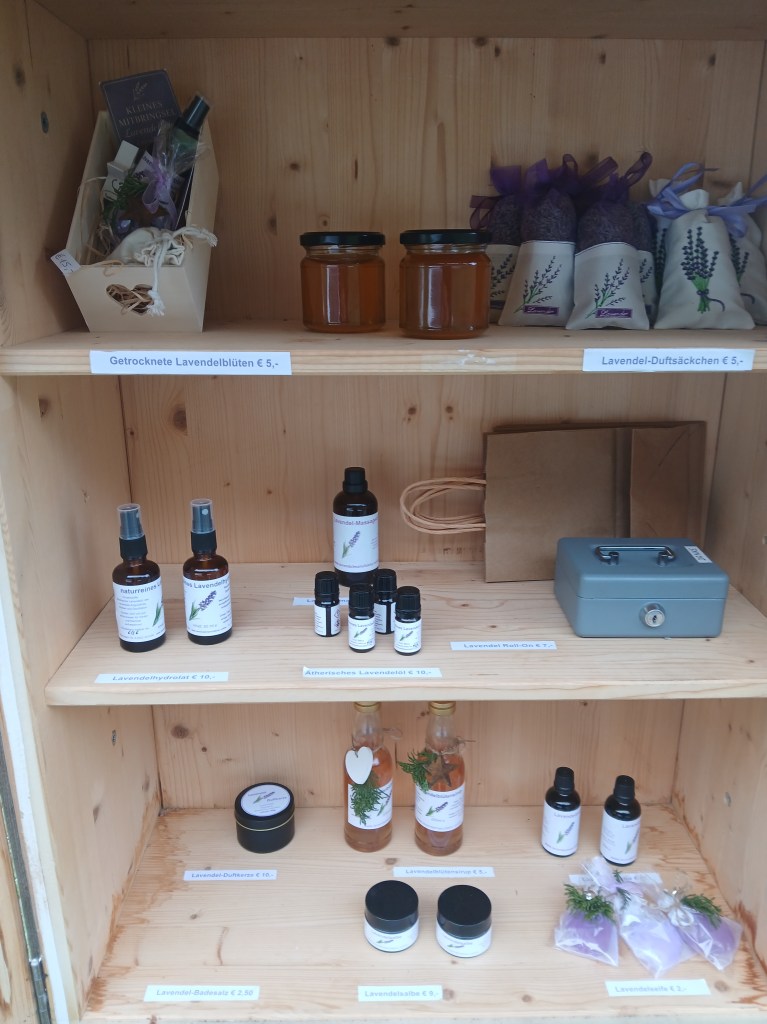 Im Winter ist unser Verkaufsstand beim Lavendelfeld nur an wärmeren Tagen gefüllt. Bei kalten Temperaturen müssen wir ihn ausräumen, damit die Qualität nicht leidet. Bei uns zuhause, per Mail oder telefonisch können Sie unsere Produkte jederzeit beziehen.